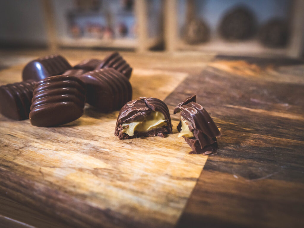 Ve výrobně pralinek vzniká čokoládové potěšení pro všechny mlsouny. Pralinky s příběhem jsou vyrobeny z poctivé čokolády obsahující 64 % kakaa a na výběr je z několika oblíbených náplní, jako jsou nugátový, pistáciový, karamelový nebo lískooříškový krém. V nabídce jsou také čokolády zdobené a ochucené sušeným či kandovaným ovocem nebo oříšky. Pracovníci pralinkárny všechny produkty ručně balí do atraktivních designových balíčků a krabiček. Klienty tak trochu rozmazlují a vymýšlí pro ně neustále něco nového dle jejich specifických požadavků.