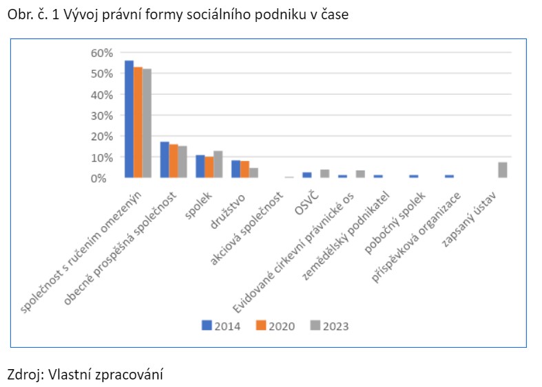 Na základě průzkumu, který jsem provedla z dat získaných v adresáři českých sociálních podniků, v roce 2023 bylo patrné, že právní forma společnosti s ručením (s.r.o.) dominuje jako nejčastější právní forma pro sociální podnikání, která představuje 52 % ze všech registrovaných subjektů. Následují je obecně prospěšné společnosti (39 %) a družstva (12 %). Tato data podtrhují vhodnost právní formy společnosti s ručením omezeným v sociálním podnikání. Zároveň ale také ukazují různorodost právních forem, které v české sociální ekonomice existují. Pokud bychom se na problematiku podívali v dlouhodobém vývoji za pomoci dat PODKLAD PRO KONCEPCI POLITIKY VLÁDY VŮČI NNO DO ROKU 2020 SOCIÁLNÍ PODNIKÁNÍ, 20141 a z dat Vyhodnocení dotazníkového šetření sociálních podniků v ČR 2019, 20192. Z obrázku níže je patrné, že v dlouhodobém horizontu převládají společnosti s ručením omezeným. Zásadní rozdíl je pouze v tom, že určité právní formy se přestaly používat nebo nově částečně začaly.