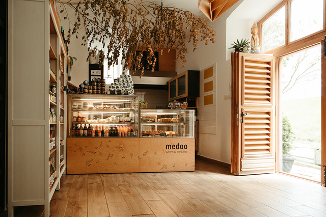 Medoo je výrobním podnikem s vlastní prodejnou – Zámeckou medárnou. Naším záměrem bylo vytvořit místo, kde lidé mohou ochutnat med v jeho mnoha podobách (dezerty, slané variace, nápoje). Současně jsme si přáli vytvořit prostor, kde budeme nabízet kvalitní výrobky malých, regionálních výrobců, kteří dělají své produkty s velkou vášní a odevzdáním.